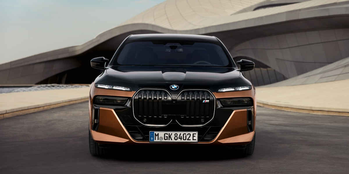 Die BMW Niere des neuen BMW i7 M70 xDrive ist von hochglänzend schwarzen Flächen umgeben und trägt ein M Logo als Hinweis auf den dynamischen Charakter des Topmodells. Die Flächengestaltung oberhalb der Niere und das mittige Einzug der Motorhaube betonen das BMW Emblem markant. Die Luftleitelemente in Wagenfarbe rahmen den mittleren schwarzen Bereich ein und lenken den Fahrtwind zu den weit außen platzierten Air Curtains. Laut Hersteller startet der BMW i7 M70 xDrive ab einem Preis von 152.250 Euro.