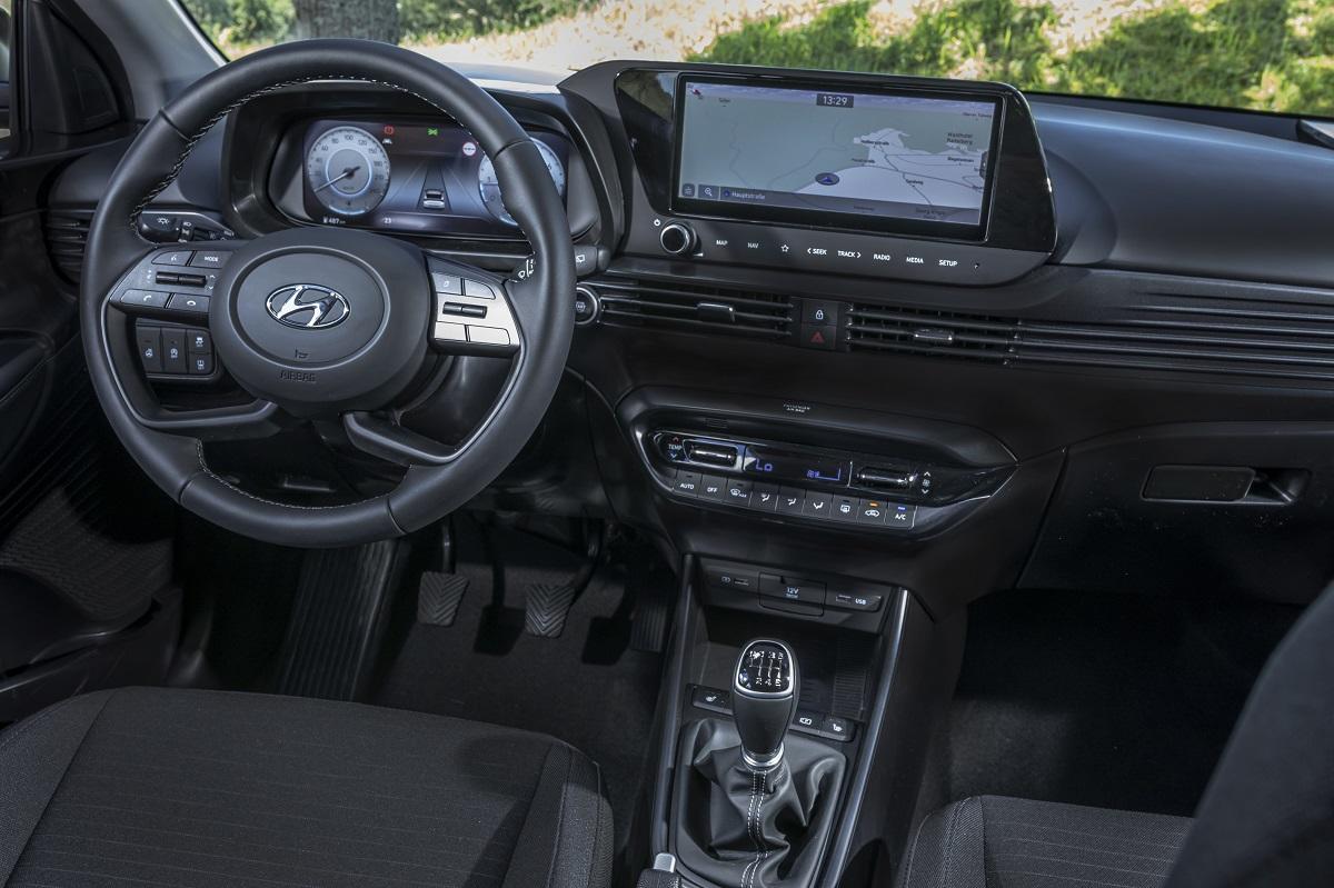 Kurz und knapp gesagt: Der i20 kann auch im Bereich Konnektivität seine großen Versprechen erfüllen – allerdings erst gegen Aufpreis bzw. in den höchsten Ausstattungslinien. Die höchste, umfangreichste Ausstattung trägt den passenden Namen “Prime“. Mit ihr soll auch das letzte Versprechen eingelöst werden, die besondere Performance und Effizienz. Das Topmodell ist ausschließlich mit den beiden Leistungsstufen des neuen Mild-Hybrid-Antriebs unterwegs: dem 1.0 T-GDI 48V mit 100 oder 120 PS und 172 oder 200 Nm Drehmoment (Kraftstoffverbrauch kombiniert: 4,4-4,7 Liter auf 100 km, 99-105 g/km CO2 und Energieeffizienzklasse A-B). Kern des milden Hybridsystems ist ein Riemen-Starter-Generator: er gewinnt einerseits Energie zurück und speist sie in einen kleinen Akku und ein 48-Volt-Bordnetz ein. Mit der Energie werden andererseits die Elektronik an Bord und der Generator mit Strom versorgt; letzterer unterstützt dann als E-Motor den Dreizylinder-Turbobenziner und drückt so den Verbrauch und Abgasausstoß. Hyundai spricht von 3 bis 4 Prozent: das kommt in etwa hin, wie sich im Test zeigt. Mit rund sechs Litern muss man im Alltags-Einsatz dennoch rechnen – einerlei, ob man sich für das Schaltgetriebe mit elektronisch gesteuerter Kupplung (iMT) oder das automatische 7-Gang-DSG entscheidet.