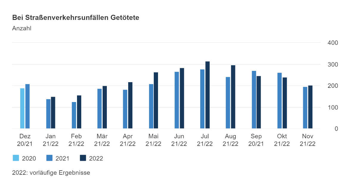 Im Straßenverkehr wurden in den ersten elf Monaten des vergangenen Jahres 2.568 Menschen getötet. Gegenüber den ersten elf Monaten des Jahres 2021 stieg die Zahl der Verkehrstoten um 9 Prozent bzw. 214 Personen an. Außerdem wurden 331 900 Menschen bei Straßenverkehrsunfällen verletzt, das sind 11 Prozent oder 33.300 mehr als im gleichen Zeitraum des vergangenen Jahres.