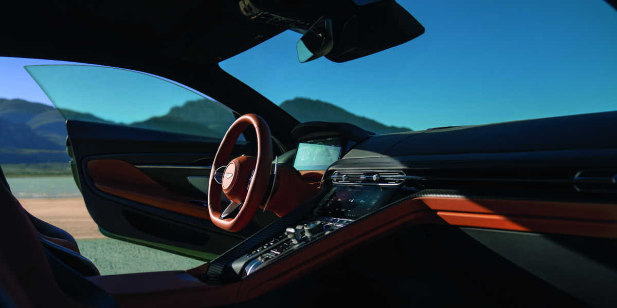 Aston Martin spendiert dem DB12 knapp 6 Millimeter mehr Spurweite an der Front und 22 Millimeter mehr an der Heckpartie. Hinzu kommt die neu geformte Kühleröffnung, LED-Scheinwerfer samt Tagfahrlicht und 21-Zoll-Räder. Das mittlerweile überarbeitete Emblem sitzt auf der Front, erstmals bei einem Sportwagen der Marke wohlgemerkt. Abgerundet wird sein Auftritt von rahmenlosen Außenspiegeln, die zu mehr Aerodynamik beitragen.