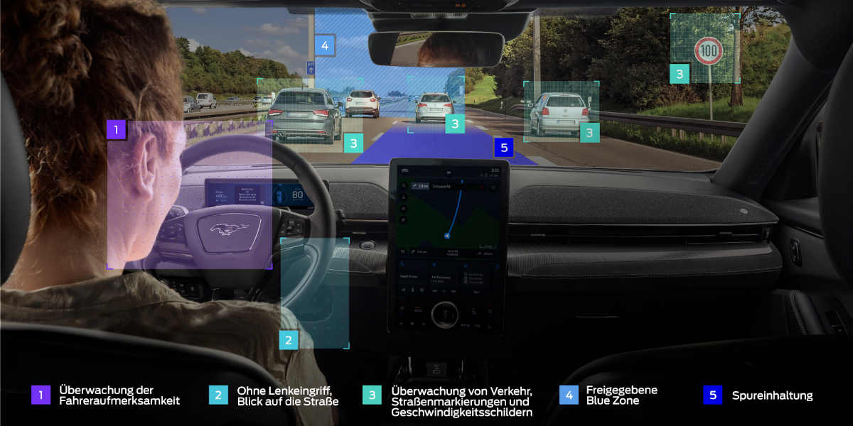 Eine weitere Kamera erfasst alle Fahrbahnmarkierungen, Geschwindigkeitsbegrenzungen sowie sich verändernde Verkehrsbedingungen vor dem Fahrzeug und passt die Lenkung, Beschleunigung und Positionierung in der Fahrspur entsprechend an. In den USA greifen über 194.000 Fahrzeuge auf das System zu und legten eine Strecke von über 175 Millionen Kilometer zurück. Als erstes Modell wird der elektrische Mustang Mach-E mit dem System in Deutschland ausgeliefert, die Bestellungen starten in den nächsten Wochen.