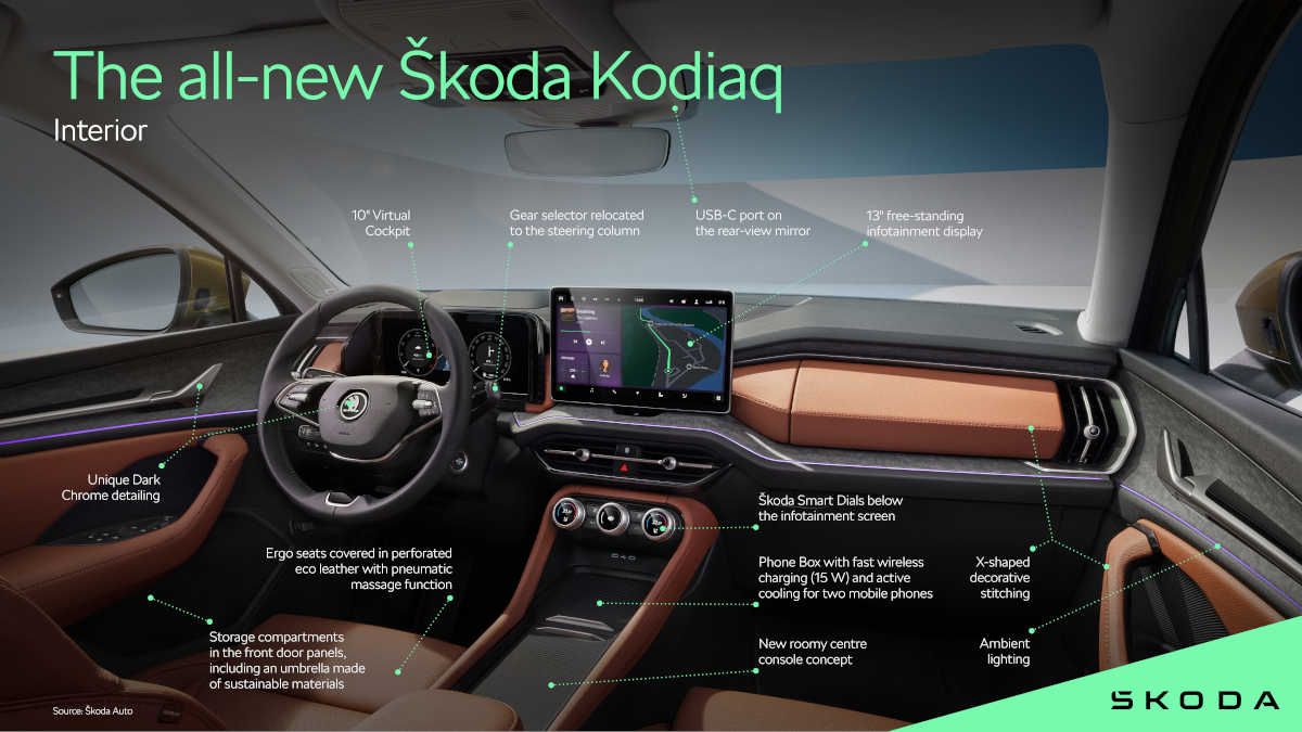 Neben dem Gangwahlhebel für das DSG, der nun an der Lenksäule platziert ist, wurden der Innenraum des Kodiaq und Superb umfassend überarbeitet. Ein Head-up-Display sowie ein 13-Zoll-Infotainmentdisplay sind prominente Neuerungen. Die Skoda Smart Dials, anpassbare Dreh-/Druckknöpfe mit digitalen Displays, bieten eine intuitive Steuerung von Fahrzeugfunktionen.