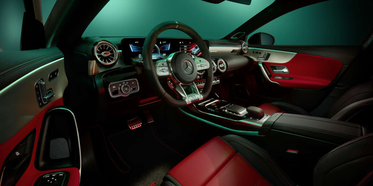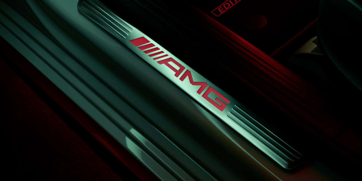 Im Innenraum geht es mit den Kontrastfarben Schwarz und Rot weiter. Die AMG Performance Sitze verfügen über zweifarbiges Leder, das AMG Performance Lenkrad ist in Mikrofaser Dinamica samt schwarzer 12-Uhr-Markierung gehalten. Kontraste setzen die AMG Einstiegsleisten mit rot beleuchtetem AMG Schriftzug sowie die AMG Fußmatten aus Velours mit roter Kontrastnaht und in Rot gewebtem “Edition 55” Schriftzug.