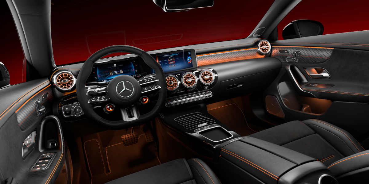 Den Innenraum des Mercedes-Benz CLA ziert ein frei stehender Doppel-Screen samt 7-Zoll- und 10,25-Zoll-Display. Sie bieten ein modernes Hightech-Erlebnis und unterstreichen die offene Raumstruktur. Wer möchte erhält ein Multifunktions-Sportlenkrad in Ledernachbildung, hinzu kommen Zierteile in Carbon-Optik dunkel, Holz Line braun oder Mikrofaser braun. Neu sind die Komfortsitze in einer Kombination aus Ledernachbildung Artico und dreidimensional geprägtem schwarzem Stoff.