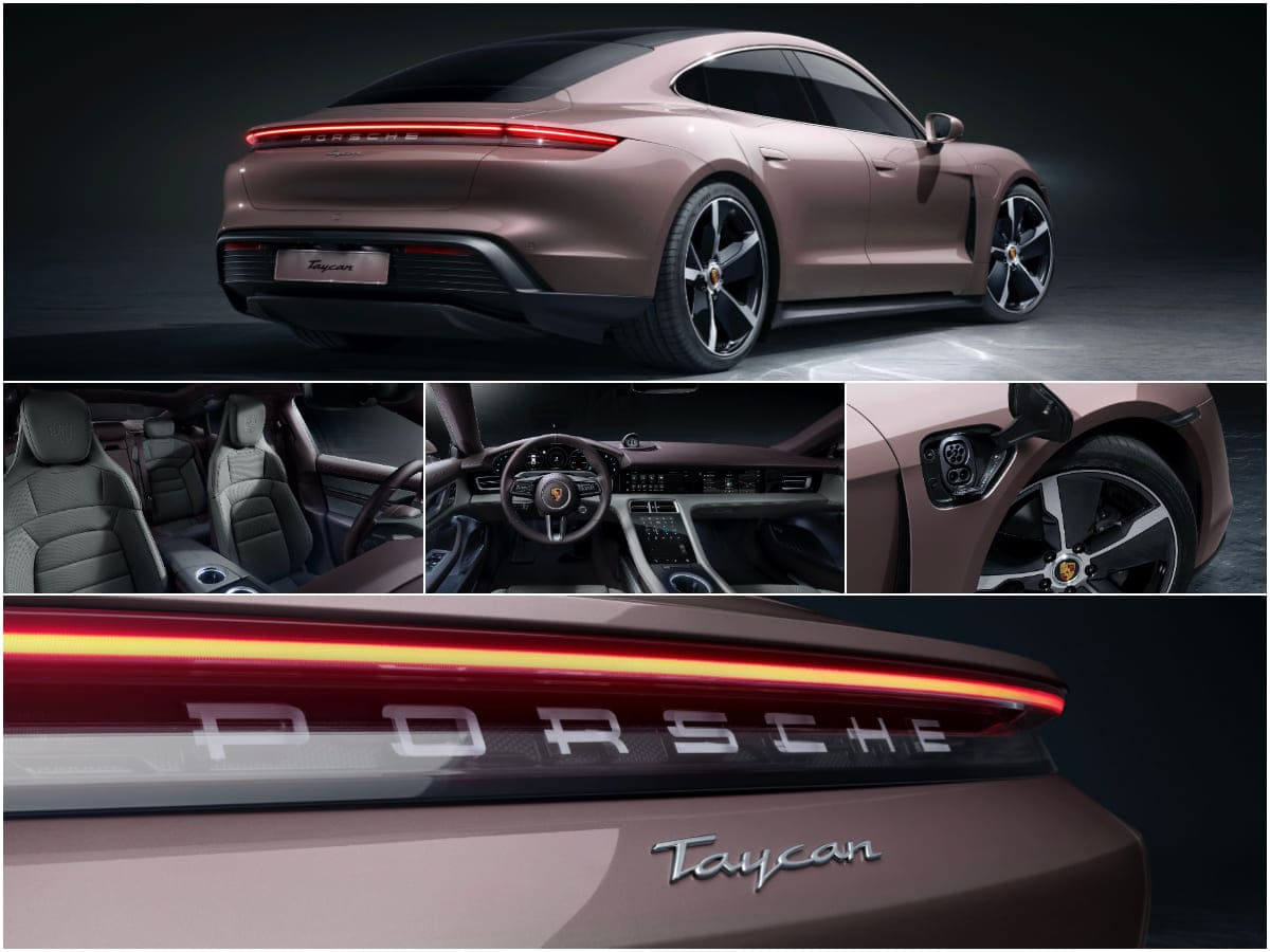 Äußerlich punktet der neue Porsche Taycan mit seinen stark gewölbten Kotflügel, einer sportlichen Silhouette und der nach hinten abfallenden Dachlinie. Die schlanke Kabine, eine stark eingezogene C-Säule und die ausgeprägten Schultern der Kotflügel führen zu einer starken, markentypischen Betonung des Hecks. Hinzu kommen innovative Elemente wie der Porsche-Schriftzug in Glas-Optik und das Leuchtenband am Heck.
