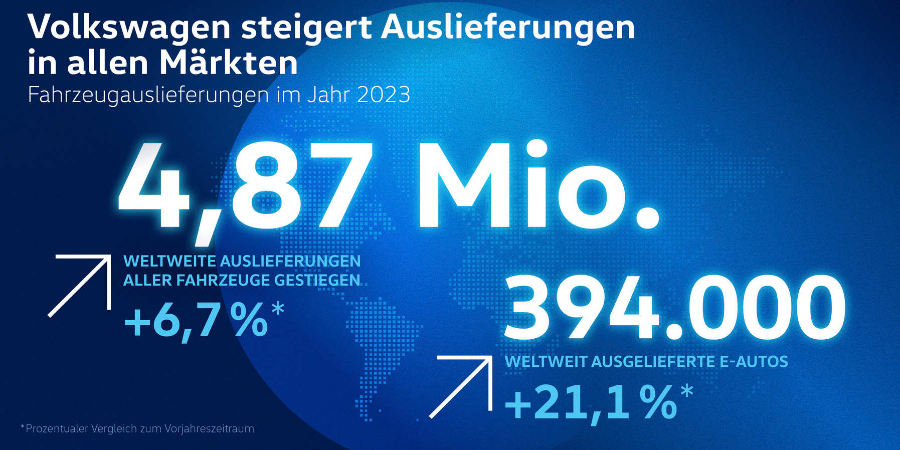 Volkswagen hat seine weltweiten Auslieferungen im vergangenen Jahr um 6,7 Prozent auf etwa 4,87 Millionen Fahrzeuge gesteigert. Besonders rasant war der Anstieg der Nachfrage nach Elektroautos: Rund 394.000 vollelektrische Fahrzeuge wurden an Kunden übergeben, was einem Wachstum von 21,1 Prozent im Vergleich zum Vorjahr entspricht.