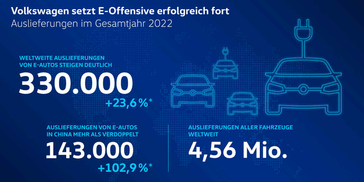 Volkswagen hat im vergangenen Jahr ein deutliches Plus beim Absatz von vollelektrischen Fahrzeugen zu verzeichnen: Der Wolfsburger Konzern setzte 2022 rund 330.000 Einheiten ab – ein Zuwuchs von 23,6 Prozent gegenüber 2021.