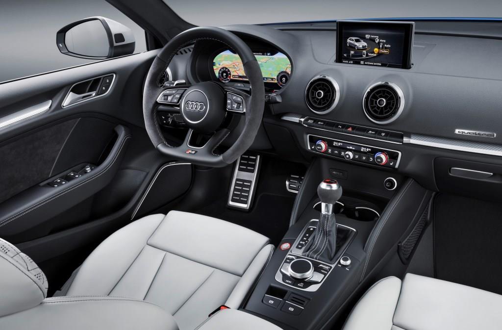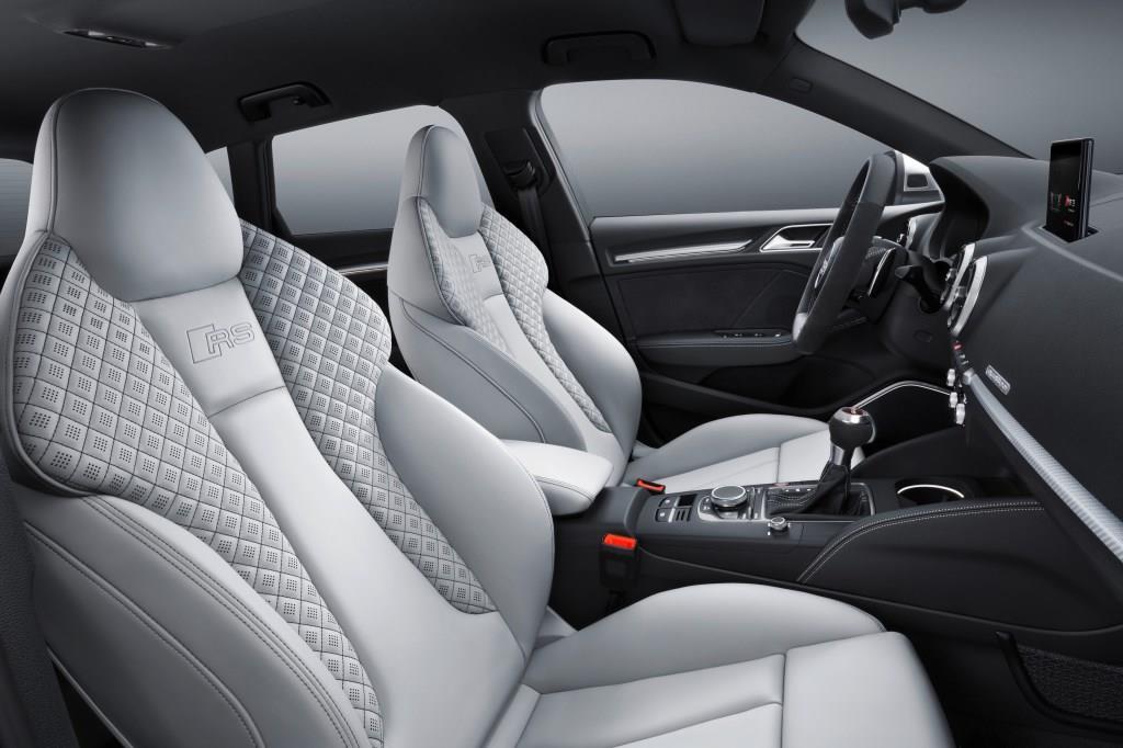 Zu spüren ist der Kraftzuwachs auch. Wer voll aufs Pedal tritt, wird vom rund 25 Kilo leichteren 2.5 TFIS jetzt noch tiefer in die serienmäßigen Nappaleder-Sportsitze gedrückt. Will man mit dem RS3 Sportback hin und wieder über die Rennstrecke bügeln, empfehlen sich die RS-Sportsitze. Sie haben integrierte Kopfstützen und einen knackigere Passform, d.h. Fahrer und Beifahrer vor allem seitlich fester im Griff. Eine Frage, die immer wieder aufblitzt, ist die nach den technischen Hilfsmitteln, mit denen Audi diese exorbitante Leistung in den Griff bekommen konnte. Denn dass sie es geschafft haben, zeigen die ersten Testmetern mit dem RS3. Den Verbrauch haben die Ingolstädter hingegen nicht in den Griff bekommen. Ein Realverbrauch weit jenseits der zehn Liter ist abartig. So betrachtet, passt er aber perfekt zu diesem Geschoß. Zurück zu den Bauteilen, die die Leistung auf den Asphalt bringen. Als erste müssen die 400 Pferde durch das blitzschnelle Siebengang-Doppelkupplungsgetriebe – so wird die Leistung in ansatzweise verträgliche Happen zerkleinert.