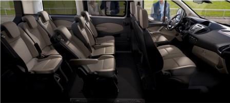 Zwei Schiebetüren samt Trittbrett erleichtern ebenfalls ab Werk das Einsteigen, auf Wunsch gibt es Premium-Ledersitze und eine Mehrzonen-Klimatisierung für die hinteren Reihen. An die Innenraumqualität eines Multivan T6 oder einer V-Klasse reicht der Ford aber nicht ganz heran. Dafür brilliert der Tourneo Custom mit seinen Qualitäten als Transporteur. In dem 4,97 Metern lange Kleinbus finden – in verschiedensten Sitzkonfigurationen – serienmäßig bis zu 8, optional sogar bis zu 9 Personen sehr bequem Platz (bequemer als im VW Bus etwa). Noch bequemer und geräumiger sitzt es sich in der Langversion, bei der die Länge und der Radstand um fast vierzig Zentimeter erweitert werden.