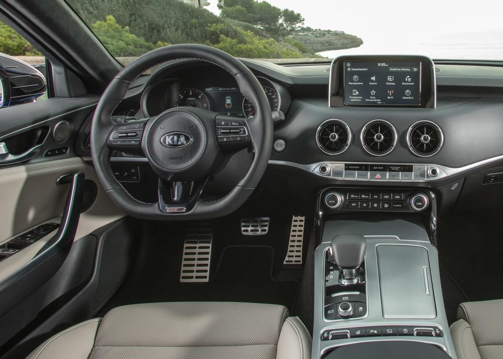 Der exklusiv in der „GT“-Ausstattung angebotene V6 3.3 T-GDI mit Direkteinspritzung, Biturbo, 370 PS und 510 Nm passt indessen zum Stinger wie der Stachel zur Biene (Kraftstoffverbrauch: 10,6 Liter auf 100 km, 244 g/km CO2 und Energieeffizienzklasse F). Wer will, kann mit ihm in weniger als fünf Sekunden auf 100 – und in der Spitze auf 270 km/h beschleunigen. Ebenso gut kann man mit dem Sechszylinder gemütlich durch die Lande streifen: in vollem Vertrauen auf die Sanftmut der Automatik und die Gelassenheit des serienmäßigen Allradantriebs. Im richtigen Modus zeigt sich der Allrad aber auch temperamentvoll und legt vier Fünftel der Leistung auf die Hinterachse. Das adaptive Fahrwerk sorgt für die perfekte Balance von Dynamik und Komfort; die Brembo-Spezialbremsanlage für die nötige Verzögerung.