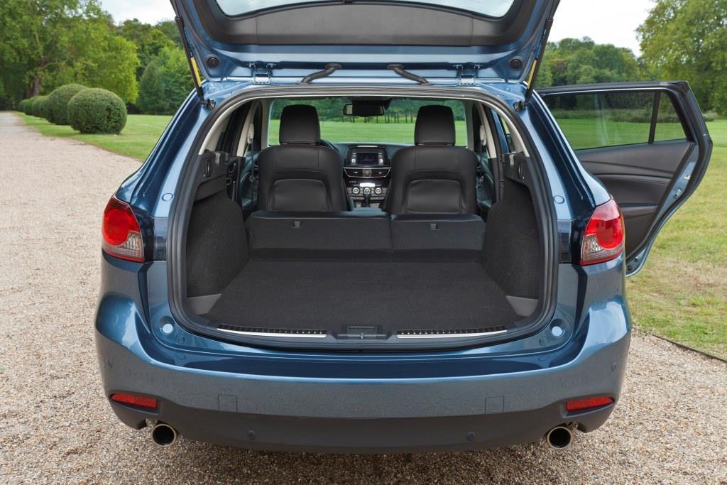 Der Kofferraum des Kombis fasst je nach Stellung der Rückbank 522 bis 1.622 Liter und verfügt unter dem Ladeboden noch über ein Kleinfach. Besonders gefallen haben uns der neue Klappmechanismus, mit dem sich die Rückenlehne in wenigen Handgriffen zu einer ebenen Ladefläche umklappen lässt; und die Tatsache, dass der Mazda 6 wegen seines geringen Gewichts (ca. 1,5 Tonnen) stattliche 530 Kilogramm Zuladung aufnehmen kann.