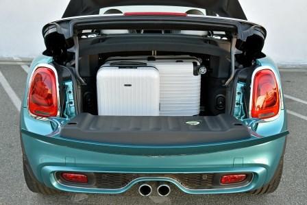 Selbstredend lässt sich das Fahrspaßmenü nach eigenem Geschmack mit zahlreichen Extras verfeinern, was Mini-Kunden ja mit Vorliebe tun – auch innen, wo das 2016er-Cabrio ab Werk aber schon um einiges Mehr zu bieten hat als der Vorgänger. Dank zehn Zentimetern mehr Länge und drei Zentimetern mehr Radstand offeriert es vorne etwa mehr Platz und Variabilität, beim Einsteigen mehr Komfort – und im Fond größere Sitzflächen. Das Ladevolumen ist ebenso gewachsen, nämlich auf 215 Liter (160 Liter mit offenem Verdeck). Das ist zwar um ein Viertel mehr als bisher, viel aber ist es immer noch nicht; das über einen Meter kürzere Smart Fortwo Cabrio bringt bspw. 340 Liter unter.