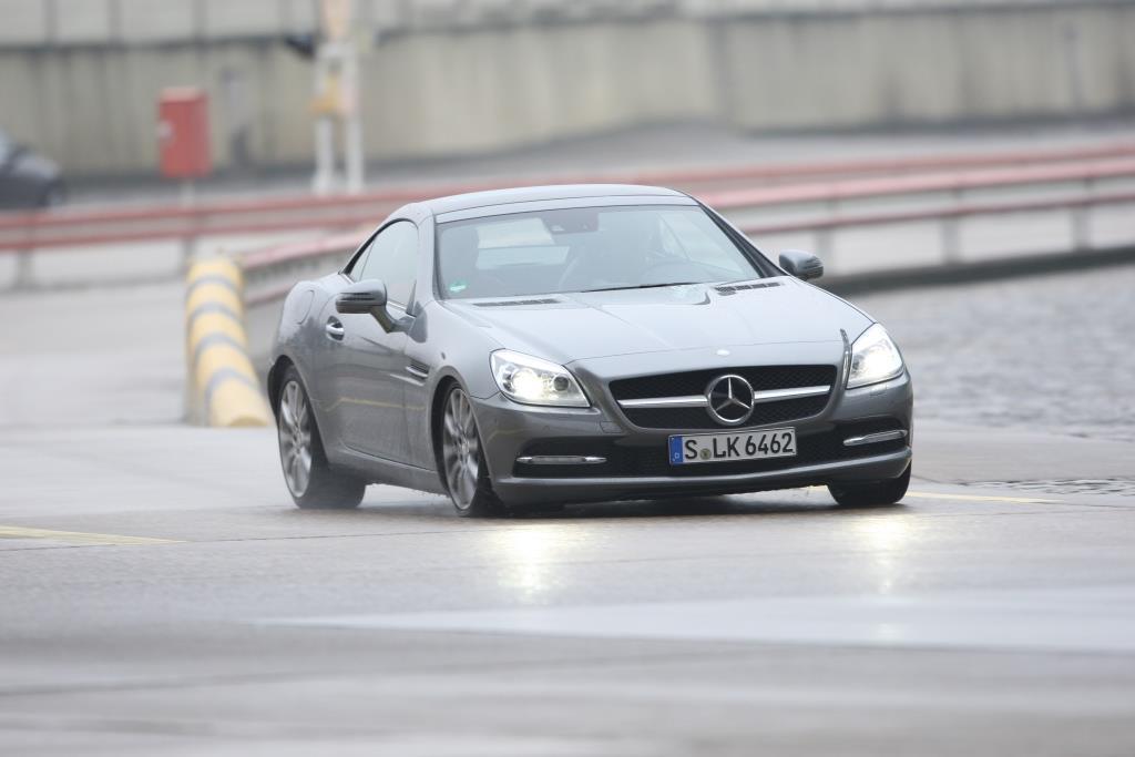 Das Mercedes Fahrdynamik-Paket bringt – trotz elektronisch geregelter Dämpfer – keinen spürbar besseren Komfort. Über langen Wellen dämpfen die adaptiven Federn in Komfort-Stellung deutlich schlechter als das Standardfahrwerk, in der Sportstellung werfen kurze Kanten den SLK zu leicht aus dem Tritt. Vorteile – wenn auch keine messbaren – generiert das adaptive Fahrwerk aber in der Fahrdynamik, insbesondere im Sport-Modus. Beim Slalom durch die Pylonen knickt der Standard-SLK vorne ein und wippt stark nach, in der Sportstellung macht der Roadster hingegen keine Kapriolen und wedelt souverän durch den Parcours.
