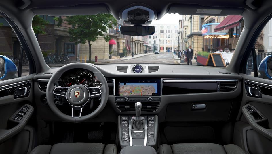 Porsche hat die Grundausstattung aufgewertet. Das erste Glanzlicht setzen die Voll-LED-Scheinwerfer, die ab Werk die Straße taghell erleuchten. Bei dem Basispreis sollte das natürlich das Mindeste sein – aber gut, jetzt ist es das auch; die dynamischen LED-Hauptscheinwerfer sind übrigens weiter extra zu berappen. Der zweite Neuzugang im Standard-Macan-Repertoire ist die Navi-Infotainment-Kombination mit dem „Porsche Communcation Manager“ samt Sprachbedienung und einem 11 statt 8 Zoll großen Touchscreen. Ebenfalls Teil des Systems ist die intuitive und individuell programmierbare Bedienung sowie das „Connect Plus“-Paket. Das heißt unter anderem: Der Macan verfügt über ein LTE-Modul, einen WLAN-Hotspot, einen SIM-Kartenleser – und das Gros der Porsche Online-Dienste, die viele Echtzeit-Infos und eine flotte Routenplanung bieten. Als dritte Basisdraufgabe wird in Leipzig ab sofort die Diebstahlwarnanlage verbaut, die auch gleich den Innenraum per Ultraschall überwacht. Beides nützliche Extras, damit a) das teure Auto bei seinem Besitzer bleibt und b) Insassen nicht ungewollt im Innenraum zurückbleiben.