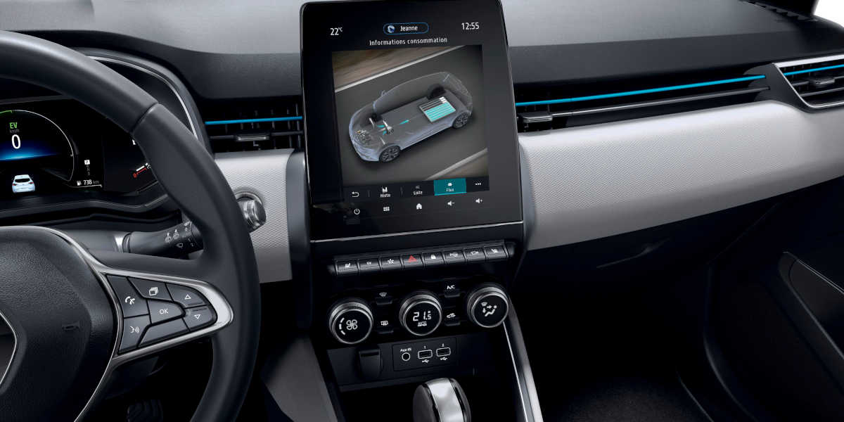 Der Fahrer hat über die Fahrprogramme auch ein Wörtchen mitzureden: er kann sich bspw. für den Hybrid- oder den EV-Elektromodus entscheiden. Beim Start legt der Clio Hybrid aber auf jeden Fall im Elektromodus los. Für den sanften Start des Benziners ist der zweite E-Motor verantwortlich. Als Starter-Generator hat er zumal die Aufgabe, den Verbrenner während der Fahrt geschmeidig zu oder abzuschalten. Im Einsatz ist die schwächere E-Maschine auch im seriellen Hybrid-Modus. In diesem Fall treibt der Benziner den E-Motor an, der dann als Generator Energie für die Batterie erzeugt.