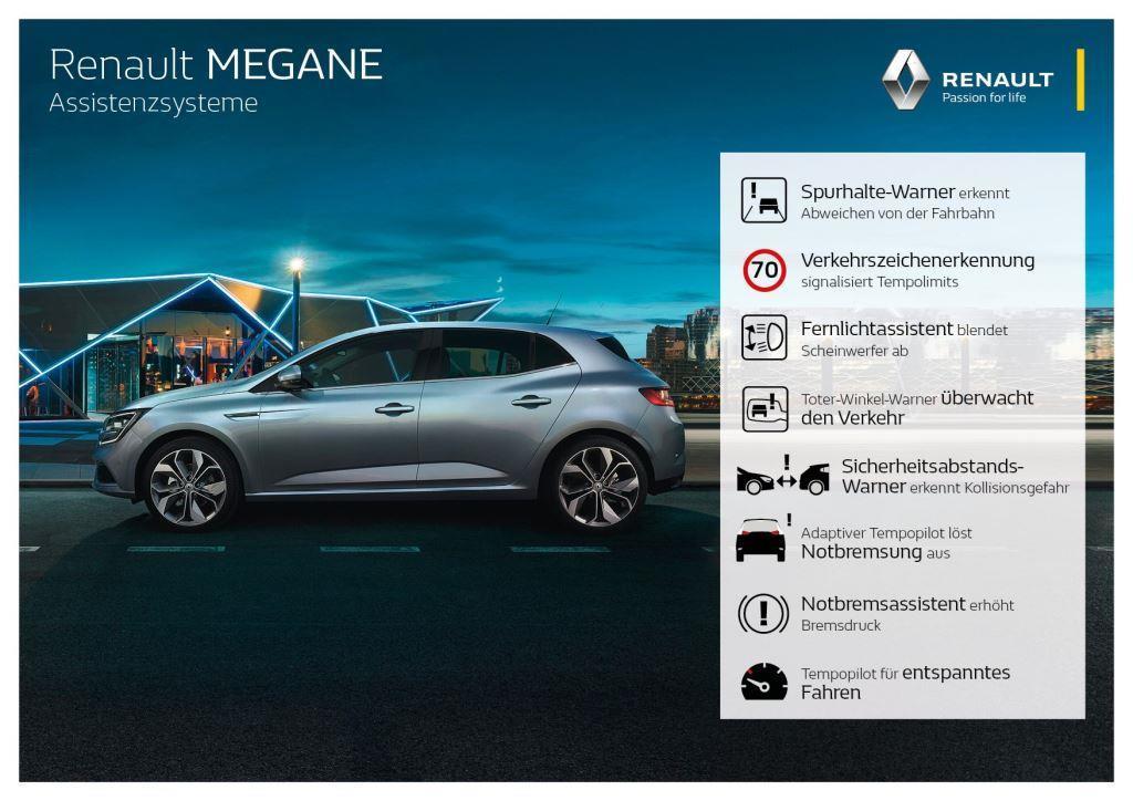 Die Sport-Ausprägung der kompakten Limousine, die nur mit dem 205 PS starken 1,6-Liter-Benziner TCe 205 erhältlich ist, lenkt nämlich mit allen vier Rädern. Dank der intelligenten Allradlenkung „4Control“ fährt sich der Mégane – trotz schwammiger Lenkung – ausgesprochen agil. In allen anderen Varianten bevorzugt der Franzose die gemütlich Gangart, die mit der indirekten Lenkung gut harmoniert. In Einklang mit dem stressfreien Vorankommen steht auch das illustre Aufgebot an Sicherheits- und Fahrassistenzsystemen. In der Basisausstattung „Life“ kann der Mégane mit einem Tempopiloten samt Geschwindigkeitsbegrenzer, einem Berganfahrhelfer und einem LED-Tagfahrlicht aufwarten. In der zweithöchsten Ausstattung „Intens“ kommen unter anderem ein Spurhalte-Warner, eine Verkehrszeichenerkennung, eine Einparkhilfe, eine automatisch Parkbremse und ein Fernlichtassistent hinzu. Optional sind ein Totwinkel- und Abstands-Warner, ein Notbrems- und ein Einparkassistenten sowie ein gut lesbares Head-up-Display erhältlich.
