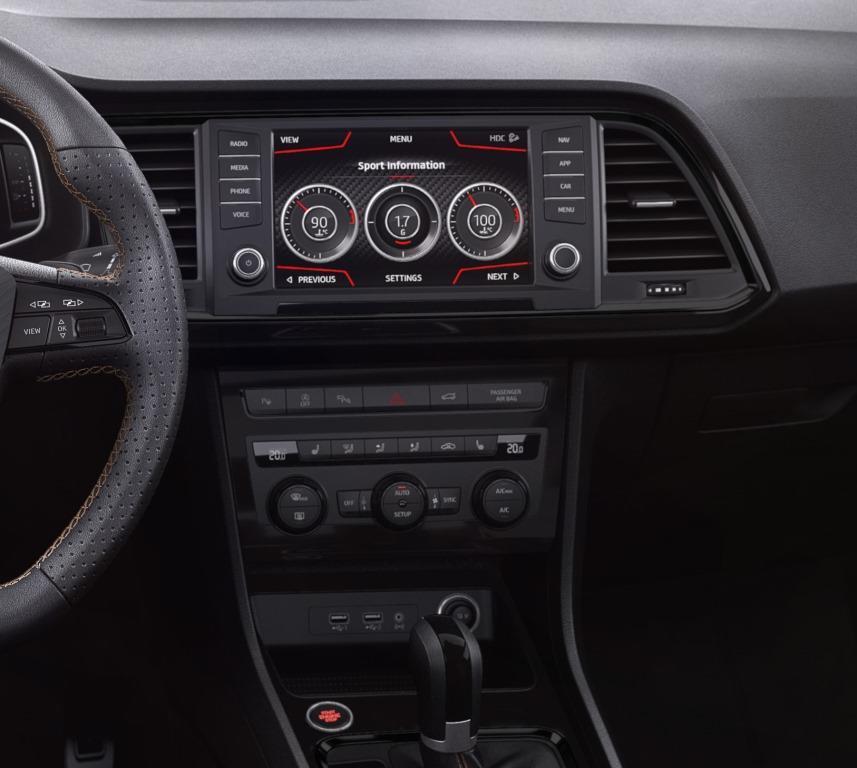 Innen ist das neue Aushängeschild der Rennsportmarke ebenfalls reich und exquisit bestückt. Feiner Alcantara-Stoff überzieht die Polsterungen an den Seitentüren und den Sitzen. Nähte in grau veredeln ihre Optik. Demselben Zweck dienen die glänzend schwarzen Bedienelemente und die Alu-Pedale. Neben dem Auge schmeichelt der Innenraum auch den technikaffinen Seelen. Ab Werk installiert Seat ein Infotainment mit 8-Zoll-Touchscreen, Navi, Smartphone-Integration und drahtloser Ladebox; außerdem ein digitales Instrumentendisplay, ein 360-Grad-Kamerasystem mit Top-View, ein schlüsselloses Zugangs- und Start-System sowie einen Parkassistenten: und das bereits erwähnte adaptive Fahrwerk DCC. Wer seinen kraftstrotzenden Ateca weiter verfeinern will, kann das mit den Carbonfaser-Paketen fürs Ex- und Interieur tun; oder mit dem Performance-Paket, das dem SUV eine Brembo-Bremsanlage mit mächtigen 18-Zoll-Bremsscheiben spendiert. Der vehemente Antritt des Cupra-SUVs kann sie vertragen.