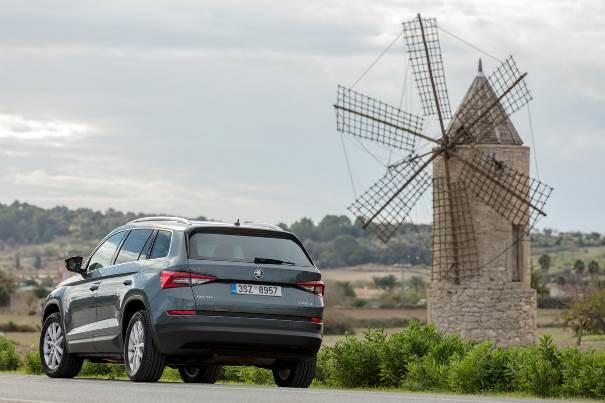 LEDs leuchten auch dem Verkehr ringsum entgegen. Der Kodiaq Soleil rollt aus dem Škoda-Werk mit LED-Hauptscheinwerfern, die ihre Leuchtintensität und Leuchtweite eigenständig den Lichtverhältnissen anpassen. Die Scheinwerferreinigungsanlage sorgt mit ihren beheizbaren Waschdüsen dafür, dass die Scheinwerfer auch bei Ausflügen ins staubige und matschige Gelände sauber bleiben. Dort und bei schlechten Straßenverhältnissen brilliert naturgemäß ein Allradantrieb. Den offerieren die Tschechen für die jeweiligen Topmotoren: den Vierzylinder-Turbobenziner 2,0 TSI 4×4 mit 190 PS und 320 Nm (Kraftstoffverbrauch kombiniert: 6,9 Liter auf 100 km, 158 g/km CO2 und Energieeffizienzklasse C); sowie den 190 PS und 400 Nm starken Vierzylinder-Turbodiesel 2,0 TDI SCR 4×4 (Kraftstoffverbrauch kombiniert: 5,8 Liter auf 100 km, 152 g/km CO2 und Energieeffizienzklasse B). Die Allradmodelle sind wie zu erwarten nicht nur im Gelände eine Bank, sondern auch als Zugmaschinen: gebremste Anhänger dürfen bis zu 2,2 bzw. 2,3 Tonnen wiegen (Benziner/Diesel). Bei den Motoren mit Frontantrieb liegt die höchstzulässige Zuglast für gebremste Anhänger 200 bis 300 Kilo tiefer – namentlich beim 1,5 TSI ACT, einem Vierzylinder-Ottomotor mit 150 PS; 250 Nm und Zylinderabschaltung (Kraftstoffverbrauch kombiniert: 6,1 Liter auf 100 km, 139 g/km CO2 und Energieeffizienzklasse B); sowie beim Diesel 2,0 TDI SCR mit 150 PS und 340 Nm (Kraftstoffverbrauch kombiniert: 5,0 Liter auf 100 km, 131 g/km CO2 und Energieeffizienzklasse A).