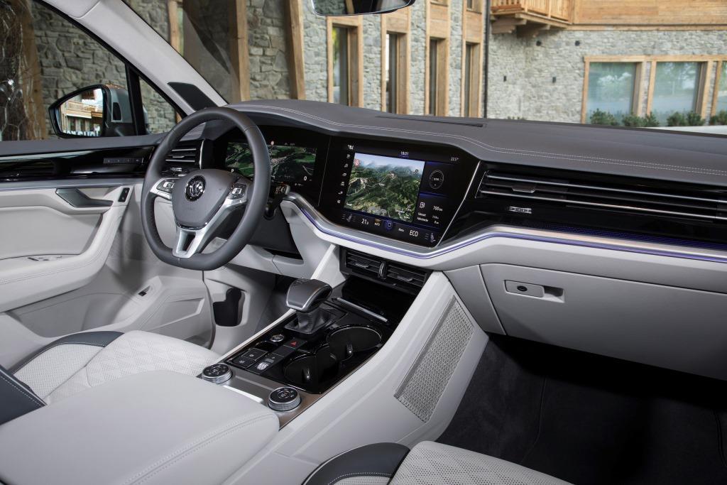 Die stattlichen Ausmaße und Abmessungen unterstreichen VWs Ambitionen: Der Touareg III soll das neue Aushängeschild des Konzerns sein. Als solches muss er Zeichen setzen, nicht zuletzt technisch. Das Interieur hat sich dafür als eine perfekte Spielwiese etabliert. VW nutzt sie, um erstmals sein futuristisches „Innovision Cockpit“ zu präsentieren. Es vereint die Bildschirme der digitalen Instrumententafel und des „Discover Premium“-Navis zu einem einzigen eleganten Wide-Screen, der hinter einer gebogenen Glasscheibe steckt. Die klassischen Bedientasten verschwinden weitgehend aus der Kommandozentrale; gesteuert wird per Gesten, Berührungen und Sprachbefehlen. Hat man sich eingearbeitet, bleibt ein beeindruckendes, auf den Fahrer ausgerichtetes Cockpit. Ebenso beeindruckend ist der Preis von 3.500 Euro. Aber auch ohne die neuen technischen Innovationen gefällt der Touareg Innenraum mit seiner höchst sorgfältigen Gestaltung und Ausarbeitung. Für Geld kann fast jeder erdenkliche Luxus installiert werden – von der 4-Zonen-Klimaautomatik bis zu den Ledersitzen mit Massagefunktion.