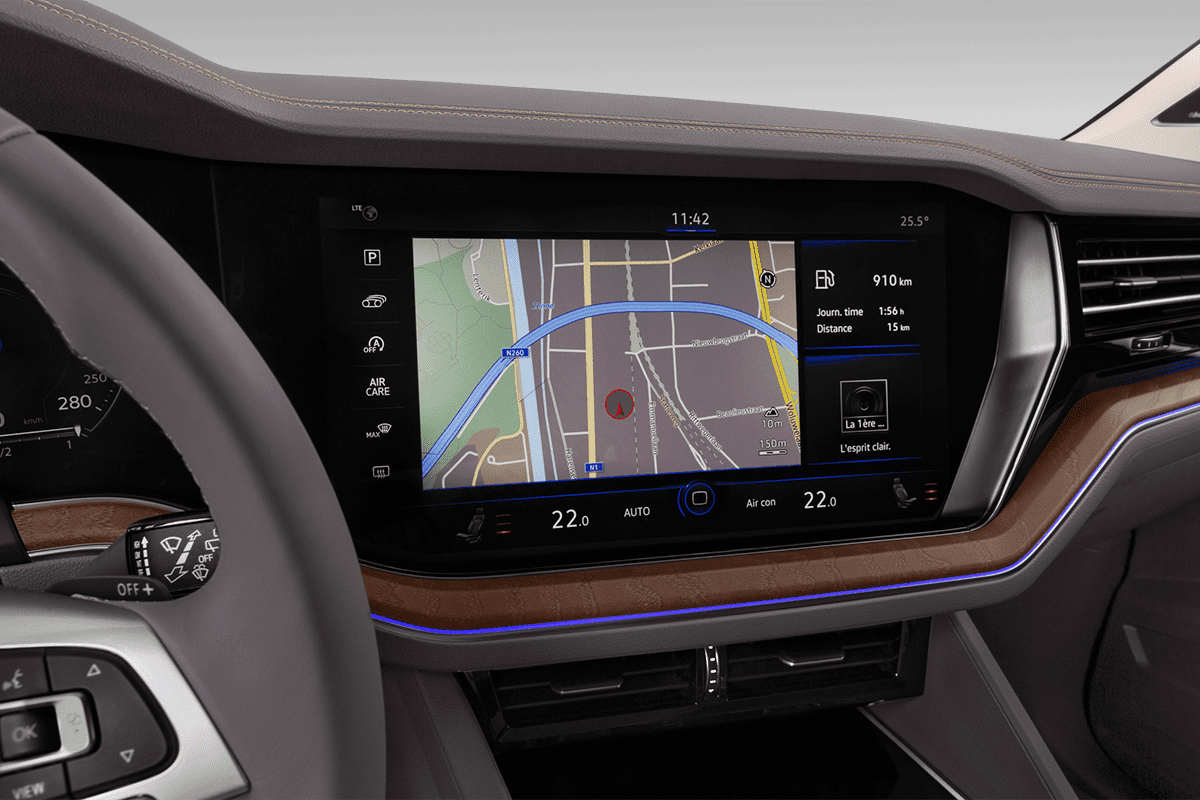Das “Innovision Cockpit” des Touareg setzt sich 2023 aus dem “Digital Cockpit” mit einer Auflösung von 1.920 x 720 Pixel und einer Diagonale von gut 30 Zentimetern zusammen; und dem 38 Zentimeter großen Touchscreen des “Discover Pro Max”-Navigationssystem. Letzteres ist Serie und trägt seinen Namen zurecht, denn VW hat die Genauigkeit der Navigation und die Auflösung der Karten erhöht. Neu ist, dass sich Smartphones auch kabellos integrieren lassen – freilich ist das längst keine Neuheit mehr.